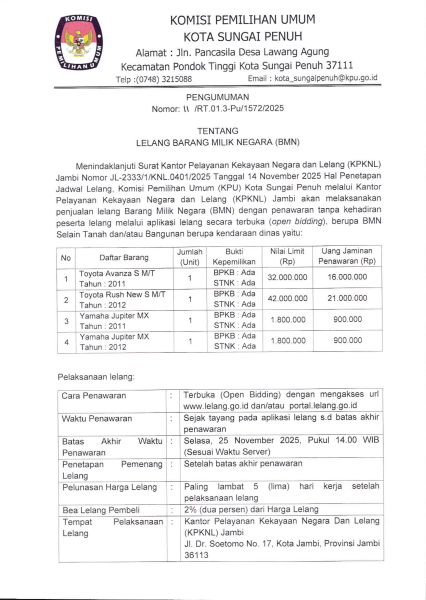 Pengumuman Tentang Lelang Barang Milik Negara(BMN). KPU Kota Sungai Penuh Melalui Kantor Pelayanan Kekayaan Negara dan Lelang(KPKNL) Jambi akan melaksanakan lelang BMN dengan penawaran tanpa kehadiran peserta lelang melalui aplikasi lelang secara terbuka (open bidding). Untuk informasi lebih lengkap dapat mengunduh surat pengumuman dengan klik disini ....