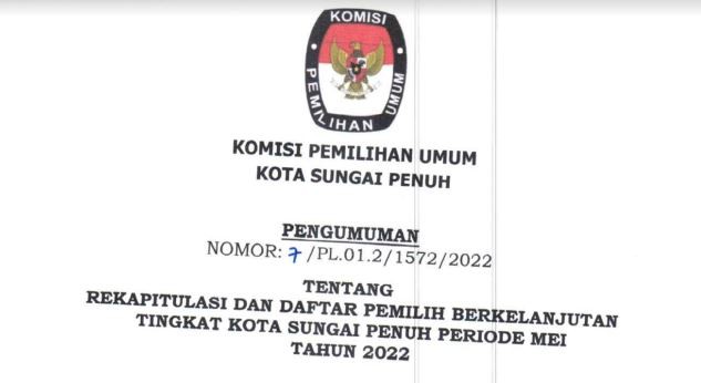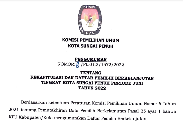 PENGUMUMAN NOMOR 7/PL.01.1-Pu/05/2022 TENTANG PENDAFTARAN PARTAI POLITIK CALON PESERTA PEMILU TAHUN 2024 << KLIK DI SINI Komisi Pemilihan Umum membuka pendaftaran Partai Politik Calon Peserta Pemilihan Umum Tahun 2024 dengan ketentuan sebagai berikut: A. DOKUMEN PENDAFTARAN 1. surat pendaftaran Partai Politik; 2. surat pernyataan dari Pimpinan Partai Politik tingkat pusat yang dibuat menggunakan formulir MODEL F-SURAT.PERNYATAAN-PARPOL yang ditandatangani oleh Pimpinan Partai Politik tingkat pusat dibubuhi cap Partai Politik dan meterai yang cukup, yang menyatakan bahwa: data dan dokumen persyaratan Partai Politik calon peserta Pemilu yang telah diinput dan diunggah melalui Sipol benar dan lengkap sesuai dengan peraturan perundang-undangan; memiliki Berita Negara Republik Indonesia yang menyatakan partai politik tersebut terdaftar sebagai badan hukum; memiliki salinan AD dan ART yang disahkan oleh menteri yang menyelenggarakan urusan pemerintahan di bidang hukum dan hak asasi manusia; memiliki kepengurusan Partai Politik di seluruh provinsi, 75% (tujuh puluh lima persen) dari jumlah kabupaten/kota dalam wilayah kepengurusan tingkat provinsi, dan 50% (lima puluh persen) dari jumlah kecamatan dalam wilayah kepengurusan tingkat kabupaten/kota; menyertakan paling sedikit 30% (tiga puluh persen) keterwakilan perempuan pada kepengurusan Partai Politik tingkat pusat dan memperhatikan 30% (tiga puluh persen) keterwakilan perempuan pada kepengurusan Partai Politik tingkat provinsi dan kabupaten/kota; memiliki anggota sekurang-kurangnya 1.000 (seribu) orang atau 1/1.000 (satu per seribu) orang dari jumlah Penduduk pada kepengurusan Partai Politik tingkat kabupaten/kota dengan kepemilikan KTA dan KTP-el atau KK anggota Partai Politik; mempunyai Kantor Tetap yang digunakan sebagai kesekretariatan dalam menjalankan fungsi Partai Politik pada setiap kepengurusan Partai Politik tingkat pusat, provinsi, dan kabupaten/kota sampai tahapan terakhir Pemilu dibuktikan dengan surat keterangan tentang Kantor Tetap pengurus Partai Politik pada tingkat pusat, provinsi, dan kabupaten/kota menggunakan formulir MODEL F-KANTOR.TETAP-PARPOL yang dilampiri rekapitulasi daftar Kantor Tetap pengurus Partai Politik pada tingkat pusat, provinsi, dan kabupaten/kota; memiliki surat keterangan tentang pendaftaran Partai Politik sebagai badan hukum yang memuat nama, lambang, dan tanda gambar Partai Politik dari menteri yang menyelenggarakan urusan pemerintahan di bidang hukum dan hak asasi manusia disertai dengan lambang dan tanda gambar Partai Politik berwarna; dan menyerahkan bukti kepemilikan nomor rekening atas nama Partai Politik pada tingkat pusat, provinsi, dan kabupaten/kota kepada KPU. 3. rekapitulasi jumlah pengurus dan anggota Partai Politik calon peserta Pemilu menggunakan formulir MODEL F-REKAP.PENDAFTARAN-PARPOL. B. WAKTU DAN TEMPAT PELAKSANAAN PENDAFTARAN 1. Waktu Pendaftaran Hari/Tanggal : Senin, 1 Agustus s.d. Sabtu, 13 Agustus 2022 Waktu : Pukul 08:00 WIB s.d. 16:00 WIB Hari/Tanggal : Minggu, 14 Agustus 2022 Waktu : Pukul 08:00 WIB s.d. 23:59 WIB 2. Tempat Pendaftaran Kantor KPU Jl Imam Bonjol No. 29, Jakarta Pusat C. LAIN-LAIN 1. Ketentuan Pengajuan Pendaftaran Partai Politik calon peserta Pemilu dapat mengajukan pendaftaran setelah mengirimkan data dan dokumen persyaratan yang diunggah melalui Sipol. Pendaftaran dilakukan oleh Pimpinan Partai Politik tingkat pusat yang sah sesuai dengan keputusan Pimpinan Partai Politik tingkat pusat tentang kepengurusan Partai Politik tingkat pusat yang disahkan oleh menteri yang menyelenggarakan urusan pemerintahan di bidang hukum dan hak asasi manusia. Dalam hal Pimpinan Partai Politik tingkat pusat tidak dapat hadir pada saat pendaftaran, dapat diwakilkan oleh Pengurus Partai Politik Tingkat Pusat atau Petugas Penghubung tingkat pusat yang diberi kuasa. Dokumen pendaftaran ditandatangani oleh Pimpinan Partai Politik tingkat pusat yang sah sesuai dengan keputusan Pimpinan Partai Politik tingkat pusat tentang kepengurusan Partai Politik tingkat pusat yang disahkan oleh menteri yang menyelenggarakan urusan pemerintahan di bidang hukum dan hak asasi manusia, dibubuhi cap Partai Politik, dan dicetak dari Sipol. 2. Dalam hal pemeriksaan kelengkapan berkas pendaftaran ditemukan: a. isian data dan unggahan dokumen persyaratan menjadi peserta Pemilu tidak lengkap; b. dokumen pendaftaran tidak lengkap; dan c. dokumen pendaftaran tidak dicetak dari Sipol, KPU mengembalikan dokumen pendaftaran Partai Politik calon peserta Pemilu. 3. Partai Politik calon peserta Pemilu yang dikembalikan dokumen pendaftarannya sebagaimana dimaksud pada angka 2 masih dapat melakukan pendaftaran sampai dengan batas akhir waktu pendaftaran pada Hari terakhir. 4. Dokumen pendaftaran Partai Politik calon Peserta Pemilu sebagaimana dimaksud pada huruf A dapat diunduh pada laman https://sipol.kpu.go.id 5. Pelayanan dan penjelasan informasi terkait pendaftran Partai Politik calon peserta Pemilu dapat menghubungi helpdesk KPU a. Telephone (021) 3916322 dan (021) 3916323 pada hari kerja pada pukul 08.00 s.d 17.00 WIB b. No Hp Sdri. Riyani Indriastuti (08170047707) dan Sdr. Firdaus Pandu Aji (083808797981) c. email : sipol@kpu.go.id