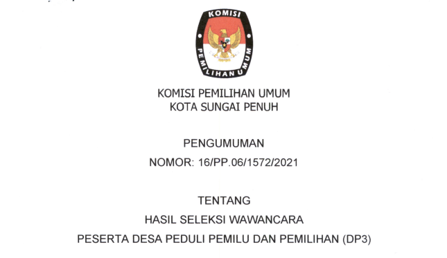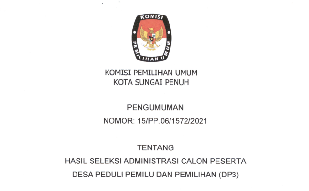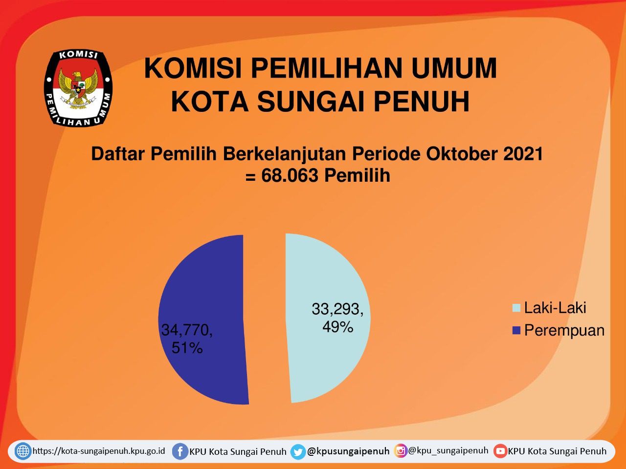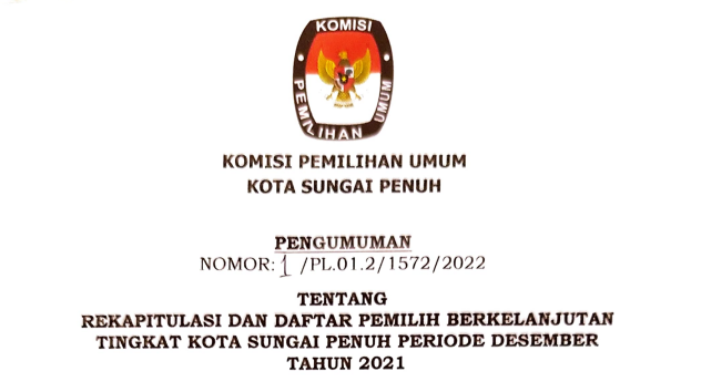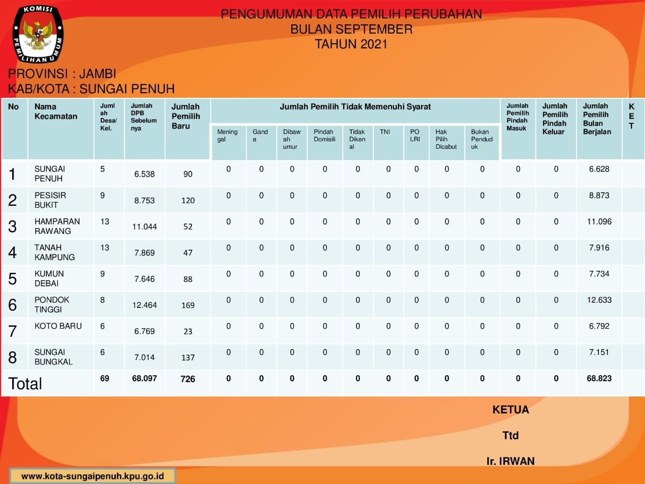 Menindaklanjuti Surat Ketua Komisi Pemilihan Umum Republik Indonesia Nomor 366/PL.02.SD/01/KPU/IV/2021 tanggal 21 April 2021 perihal Perubahan surat Plt. Ketua Komisi Pemilihan Umum Republik Indonesia Nomor 132/ PL.02.SD/01/KPU/II/2021 tanggal 4 Februari 2021 perihal Pemutakhiran Data Pemilih Berkelanjutan Tahun 2021, KPU Sungai Penuh mengumumkan Rekapitulasi Daftar Pemilih Berkelanjutan untuk Periode bulan Agustus Tahun 2021 dengan jumlah pemilih sebanyak 726 (tujuh ratus dua puluh enam) dengan rincian pemilih laki-laki berjumlah 372 (tiga ratus tujuh puluh dua) pemilih dan pemilih perempuan berjumlah 354 (tiga ratus lima puluh empat) pemilih, tersebar di 8 (delapan) Kecamatan.