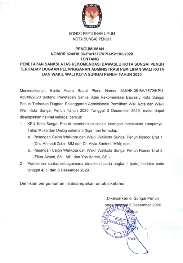 Penetapan Sanksi atas Rekomendasi Bawaslu Kota Sungai Penuh terhadap dugaan Pelanggaran Administrasi Pemilihan Wali Kota dan Wakil Wali Kota Sungai Penuh Tahun 2020