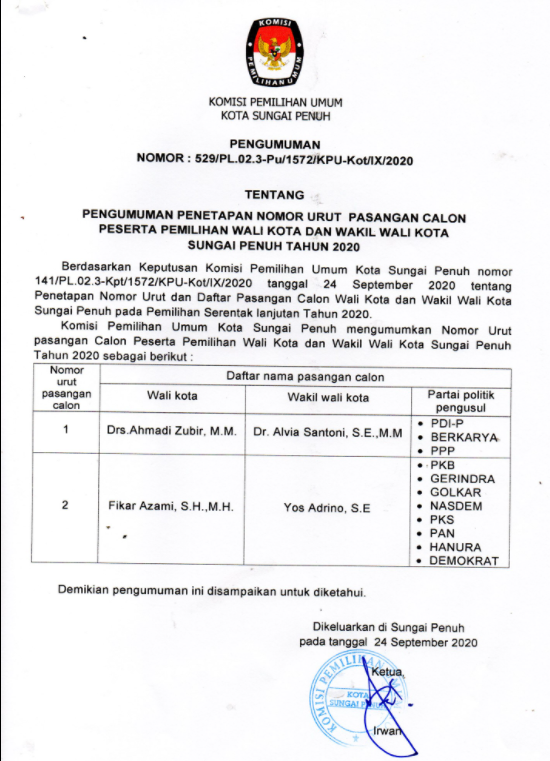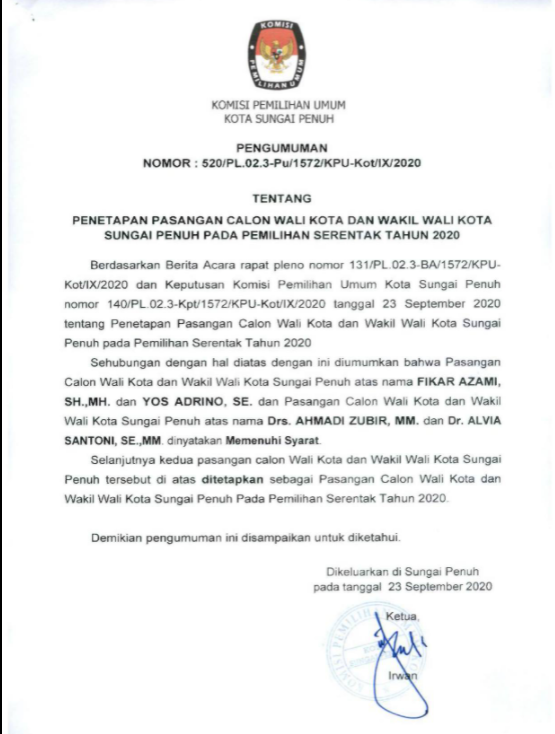 KPU Kota Sungai Penuh dengan ini mengumumkan bahwa telah menerima dokumen perbaikan bakal calon Wali Kota dan Wakil Wali Kota Sungai Penuh sebagai berikut: