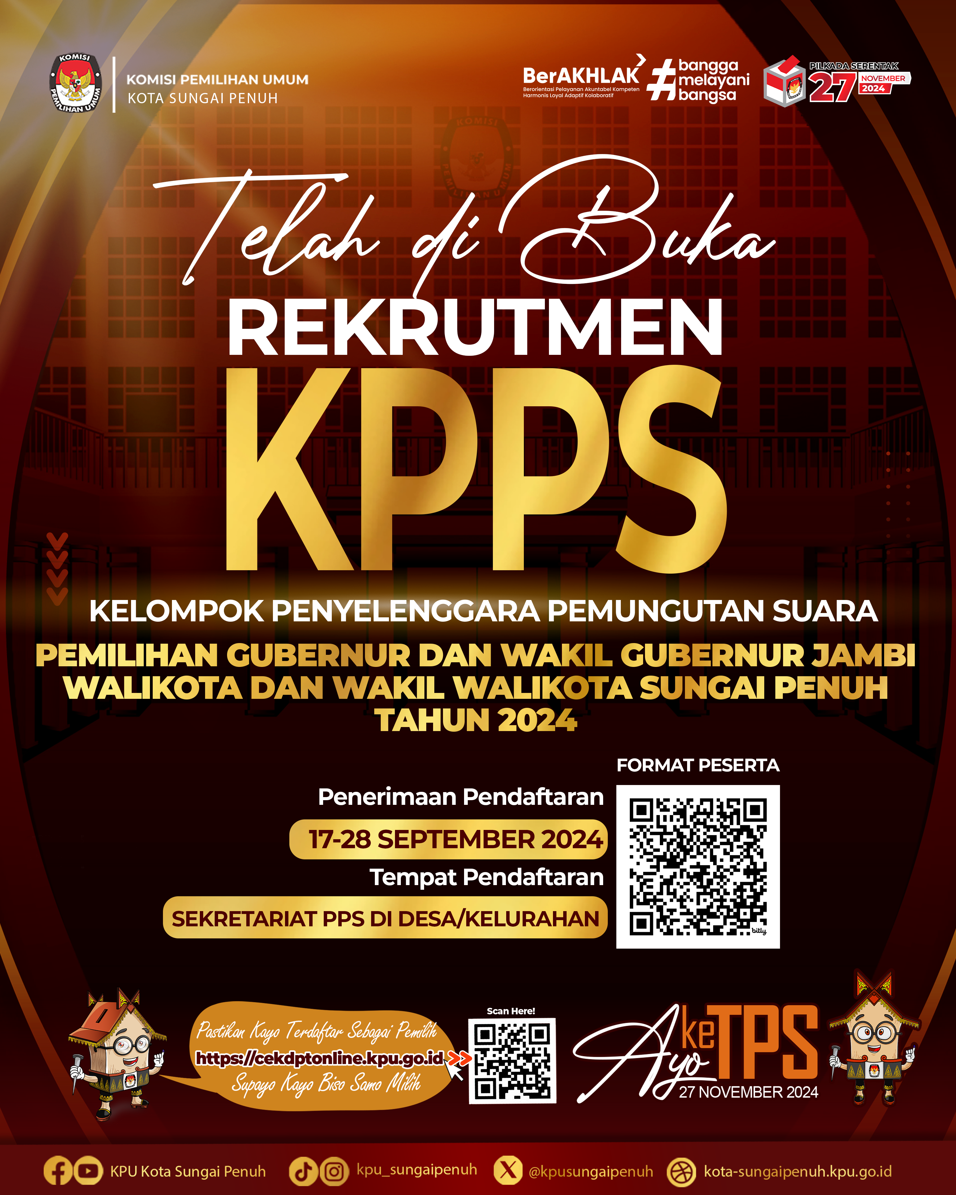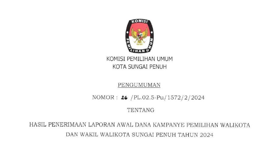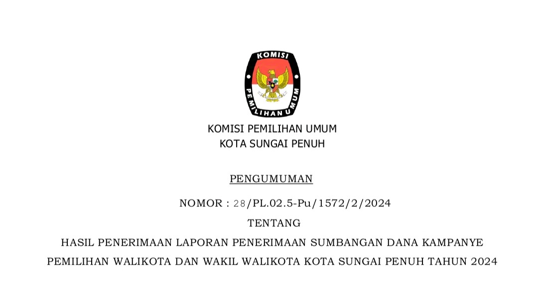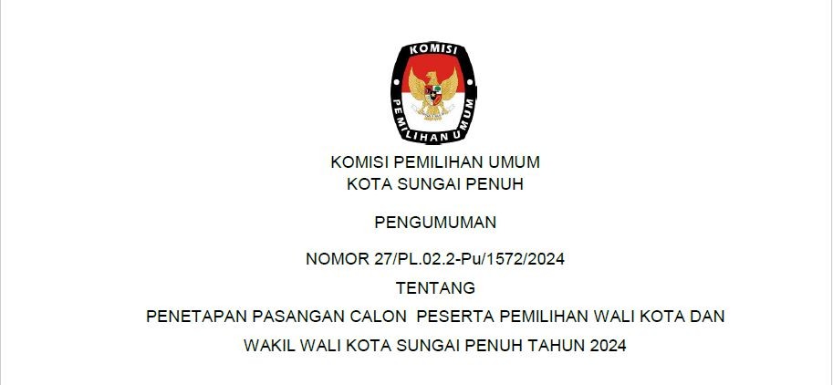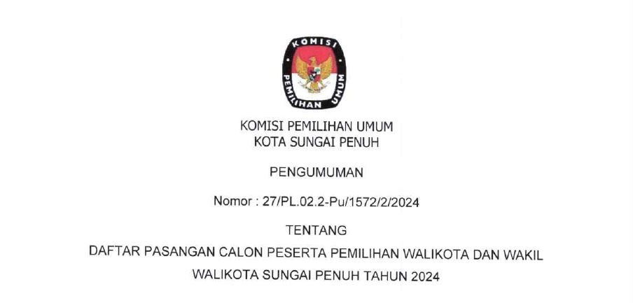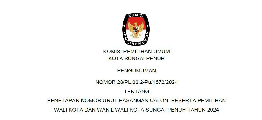 BERIKUT PENGUMUMAN PENETAPAN NOMOR URUT PASANGAN CALON PESERTA PEMILIHAN WALIKOTA DAN WAKIL WALIKOTA SUNGAI PENUH TAHUN 2024, DAN SURAT KEPUTUSAN KOMISI PEMILIHAN UMUM TENTANG PENETAPAN NOMOR URUT PASANGAN CALON PESERTA PEMILIHAN WALIKOTA DAN WAKIL WALIKOTA SUNGAI PENUH TAHUN 2024, DAPAT DIUNDUH DISINI