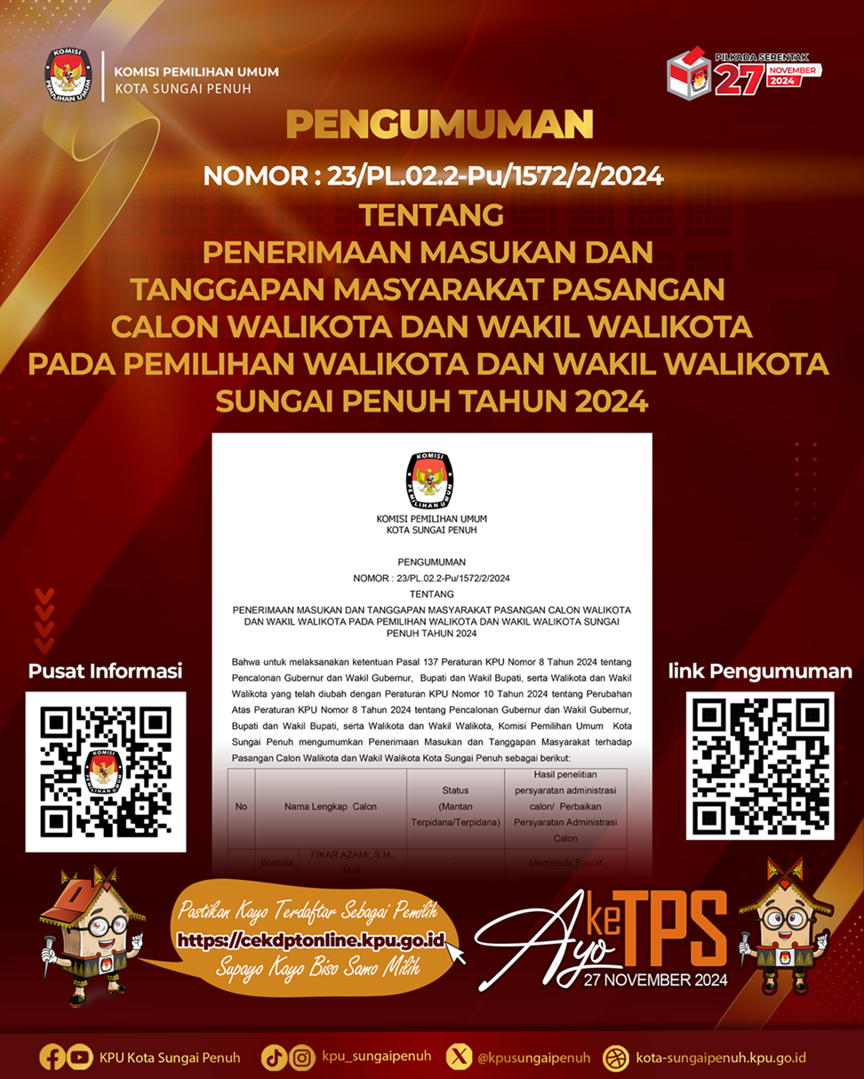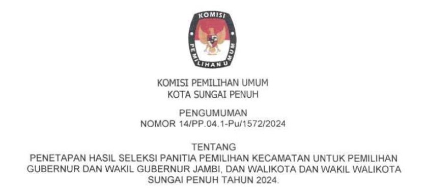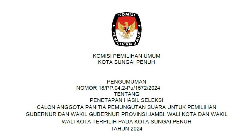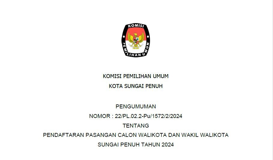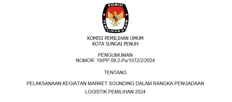 Bedasarkan Surat Komisi Pemilihan Umum Nomor 2334/PP.09.2-SD/06/2024 perihal Pemberitahuan/Pengumuman Pelaksanaan Kegiatan Market Sounding dalam Rangka Pengadaan Logistik Pemilihan 2024 pada Rapat Koordinasi dan Bimbingan Teknis Persiapan Pengadaan Logistik Pemilihan Gubernur dan Wakil Gubernur, Bupati dan Wakil Bupati, serta Walikota dan Wakil Walikota Tahun 2024, berikut kami umumkan Pelaksanaan Kegiatan Market Sounding dalam rangka Pengadaan Loistik Pemilihan 2024