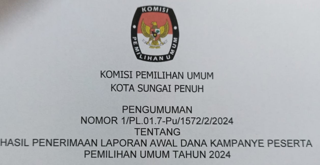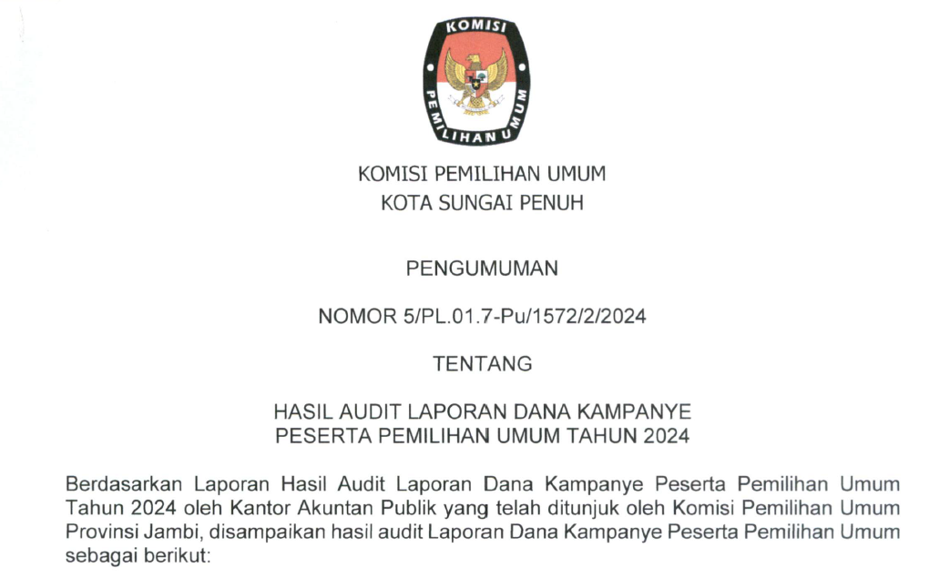 Berdasarkan Laporan Hasil Audit Laporan Dana Kampanye Peserta Pemilihan Umum Tahun 2024 oleh Kantor Akuntan Publik yang telah ditunjuk oleh Komisi Pemilihan Umum Provinsi Jambi, disampaikan hasil audit Laporan Dana Kampanye Peserta Pemilihan Umum.