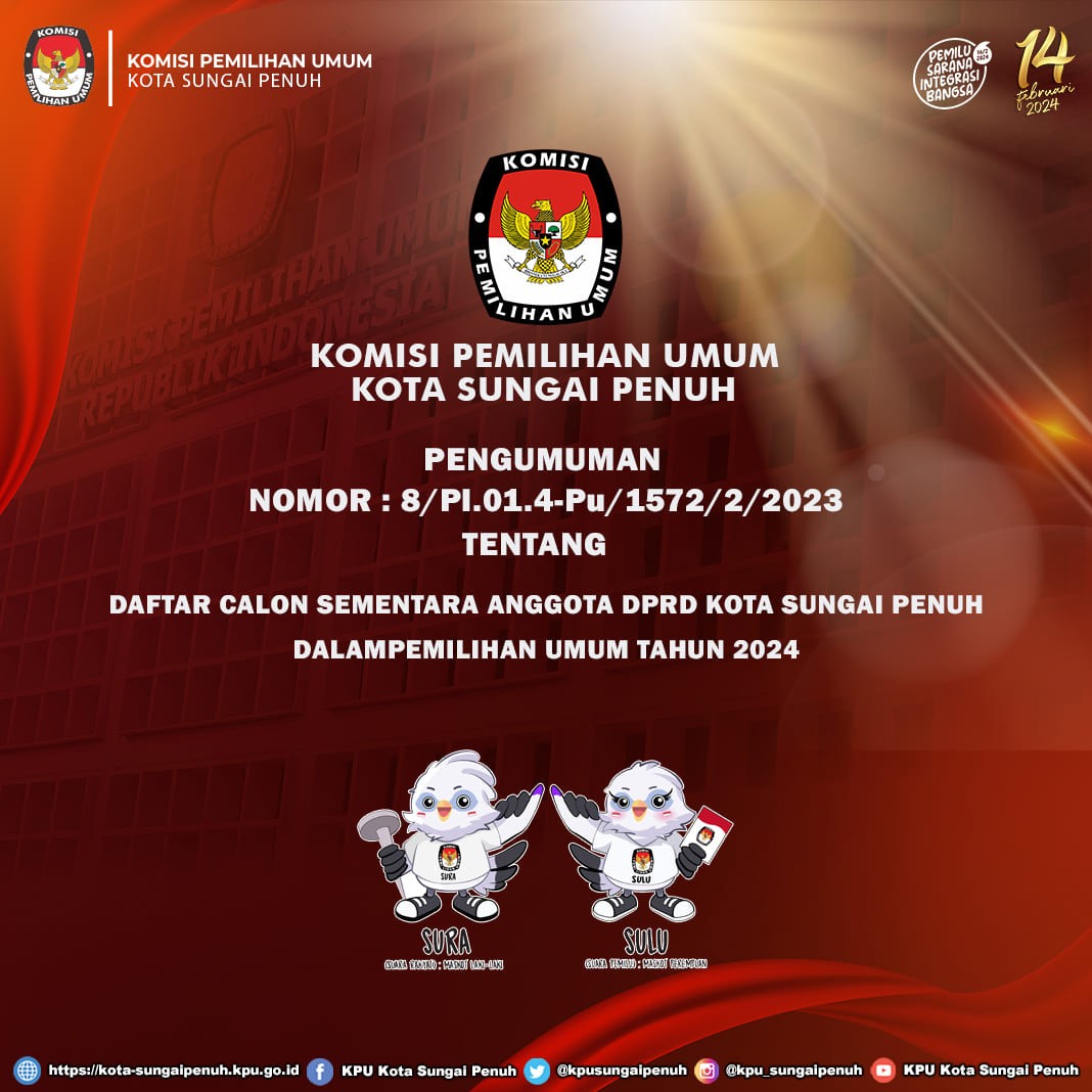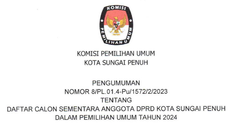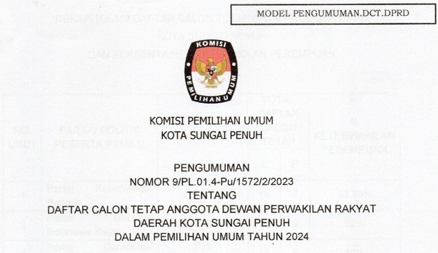 SUNGAI PENUH – Melaksanakan amanat peraturan Komisi Pemilihan Umum Nomor 10 Tahun 2023 tentang Pencalonan Anggota Dewan Perwakilan Rakyat, Dewan Perwakilan Rakyat Daerah Provinsi, dan Dewan Perwakilan Rakyat Daerah Kabupaten/Kota, KPU Kota Sungai Penuh, Sabtu (19/08/2023) mengumumkan Daftar Calon Sementara (DCS) bakal calon anggota Dewan Perwakilan Rakyat Daerah (DPRD) Kota Sungai Penuh. Sebelumnya, Jumat (18/08/2023) KPU Kota Sungai Penuh telah menetapkan Daftar Calon Sementara (DCS) bakal calon anggota Dewan Perwakilan Rakyat Daerah (DPRD) Kota Sungai Penuh pemilu serentak tahun 2024.