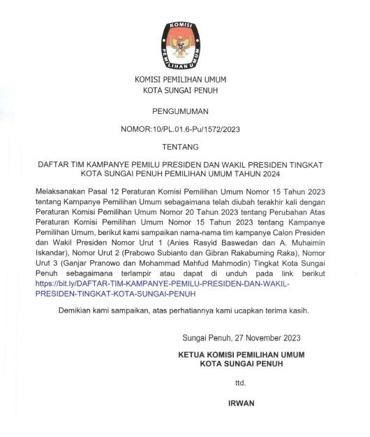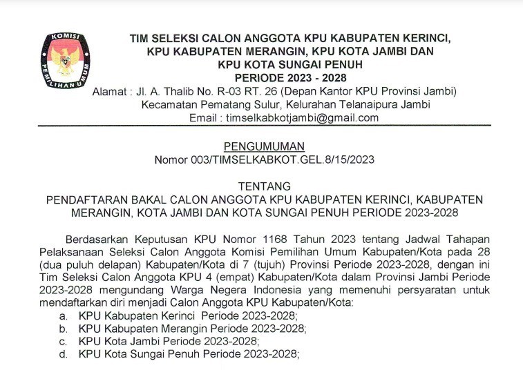 ”Dalam pengumuman DCS itu ada alamat akun email, dimana masukan dan tanggapan dikirimkan, dapat juga melalui website infopemilu.kpu.go.id dan melalui surat yang ditujukan ke KPU Kota Sungai Penuh, tentunya dengan bukti identitas diri (seperti: KTP-el, Paspor, dan/atau identitas lainnya) serta bukti relevan, dan akan kita terima dari tanggal 19 Agustus 2023 s.d 28 Agustus 2023,”tegasnya.(zz/cep/met)